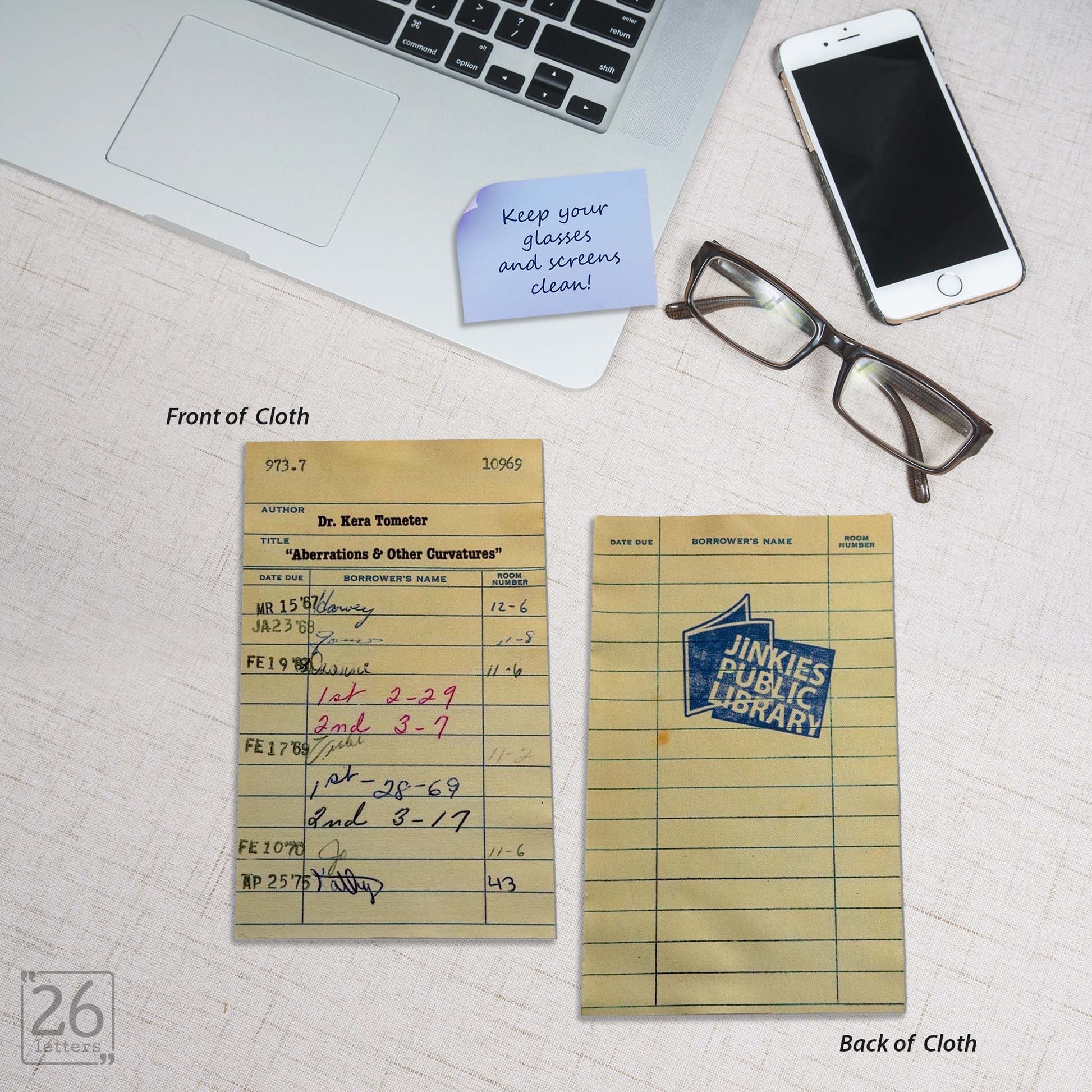 Need a way to keep your glasses and screens clean while letting your bookworm side shine? Check out our 'Jinkies' microfiber cloths available in 10 different classic literary styles, plus a library card!